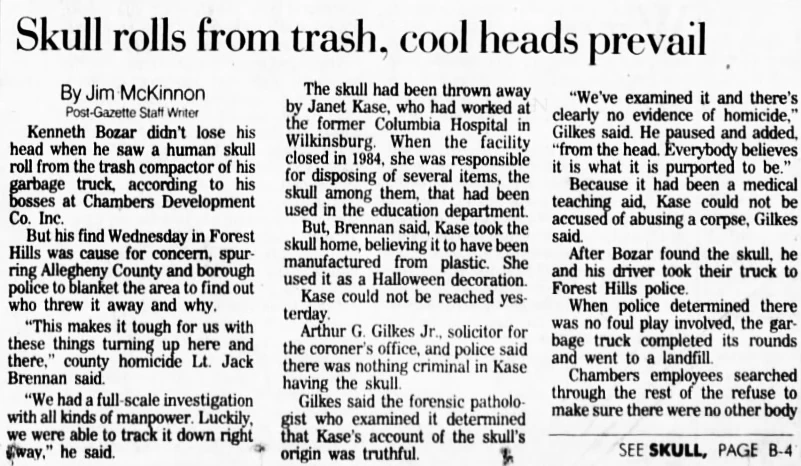 The skull was thrown into the trash by an employee of the Columbia Hospital in Wilkinsburg, Pennsylvania and had been allegedly used as a teaching aid. The employee disposed of the skull assuming it was made of plastic. It was then discovered in the trash truck and was determined to be human. Investigators determined no homicide or foul play was involved and the skull was likely very old. The name 'John' was written on the skull.