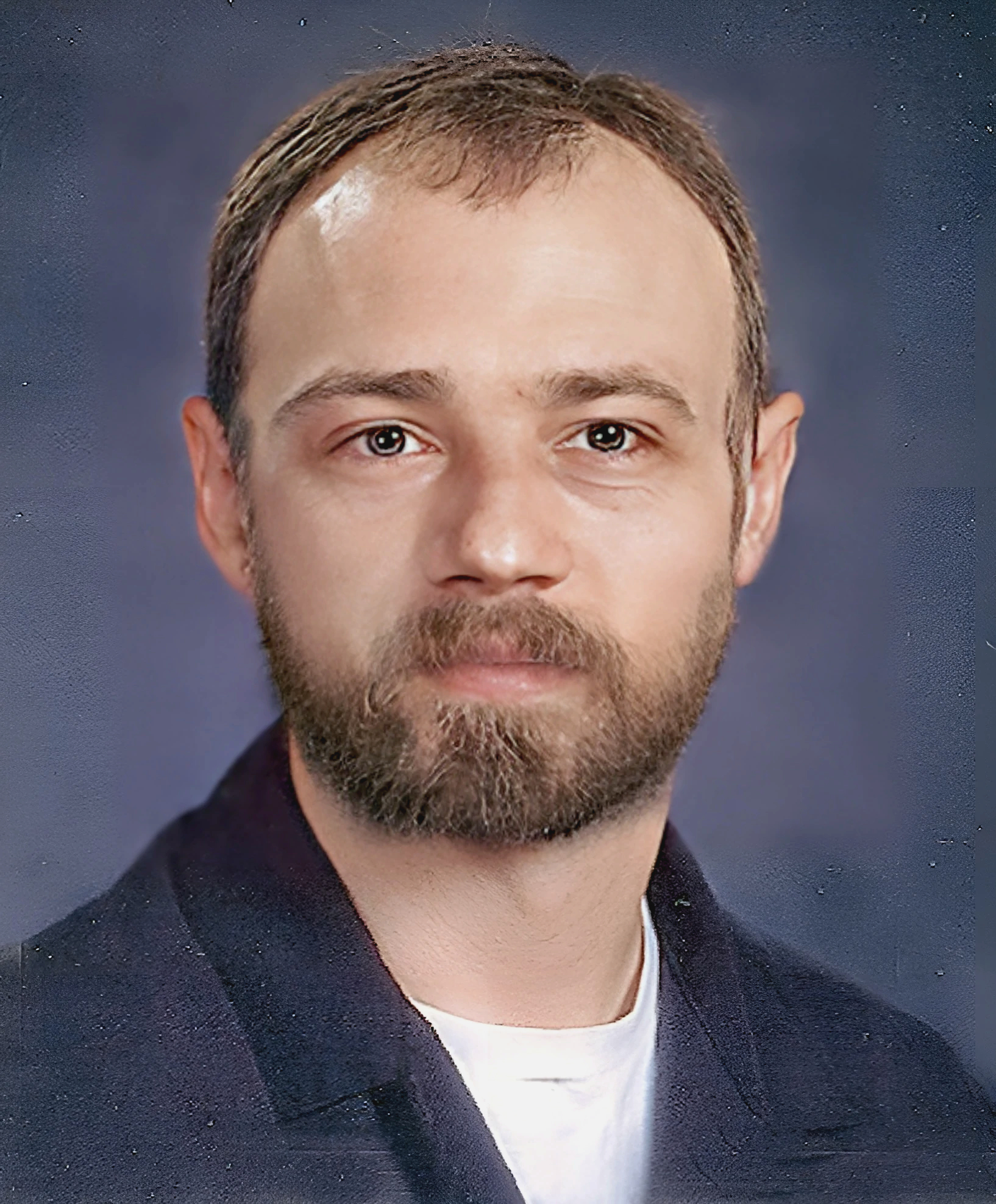 - Full beard and mustache.