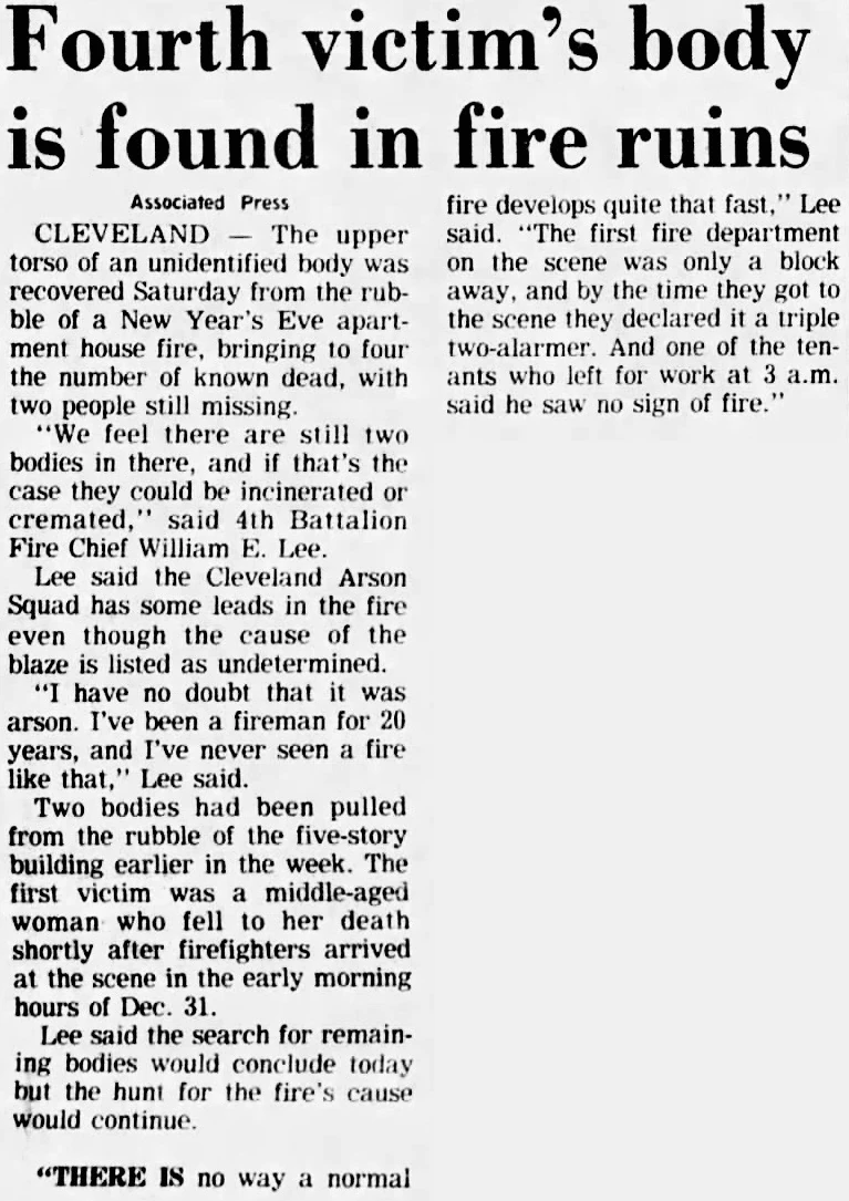 The victim perished in a severe fire at a low-rent apartment building on December 31. It took several days to find all the bodies, as the building had been badly damaged due to the blaze. Six people were reported missing in the fire, but only four bodies were found. Police believed the fire was most likely arson, but it is unclear if anyone was charged with the crime.
