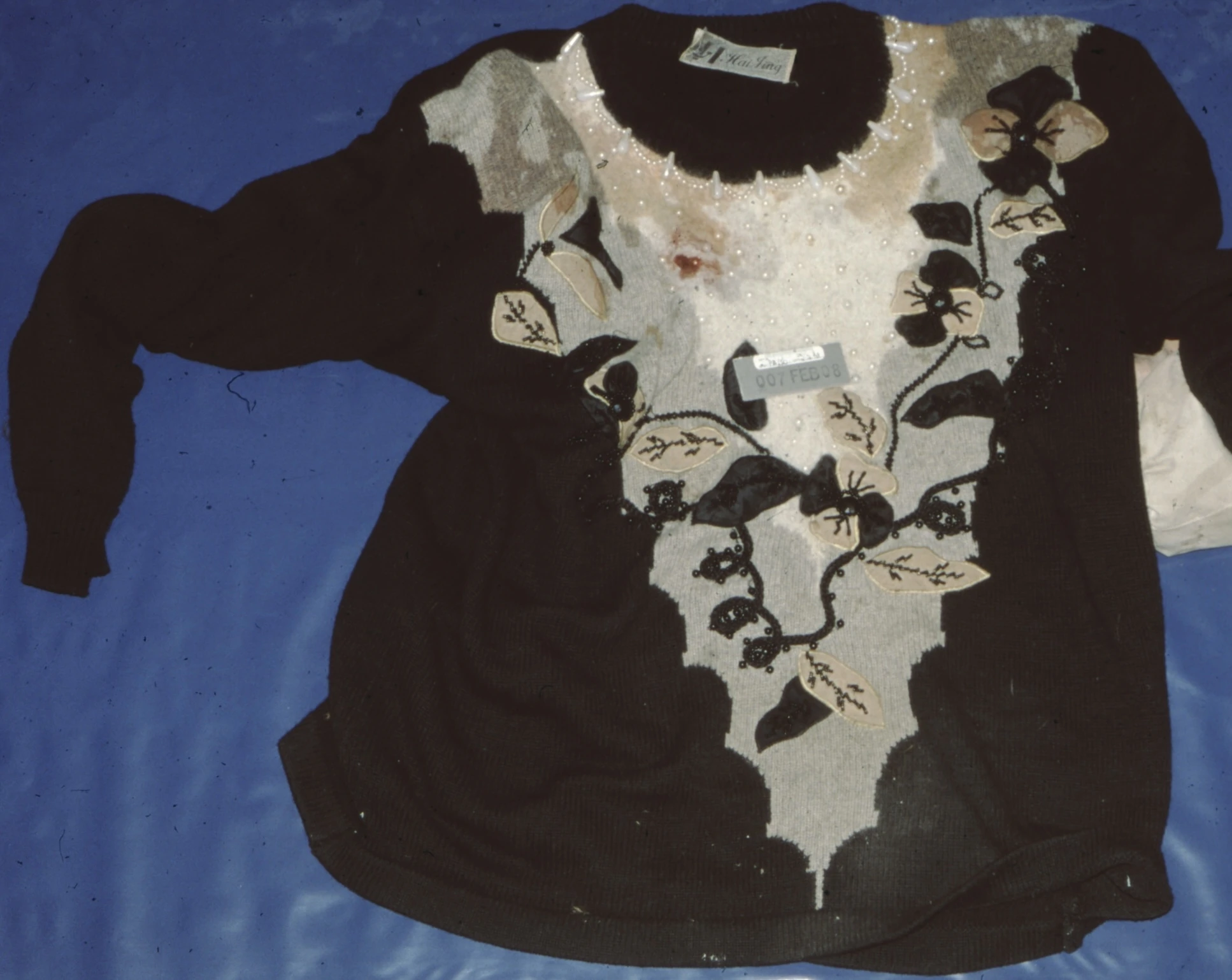 - Black/white, gray and brown Hai Jing sweater with beads.