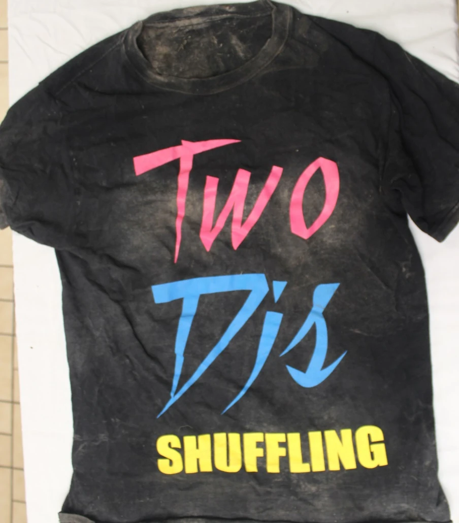 - Black T-shirt with "Two DJs SHUFFLING".