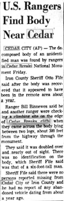 The victim was located by two park rangers who were checking a climbing site on the edge of the Cedar Breaks cliffs near Sunset View Lookout. He was arched between two logs and was about 300 feet from the highway that goes through the monument and was nearly out of sight.