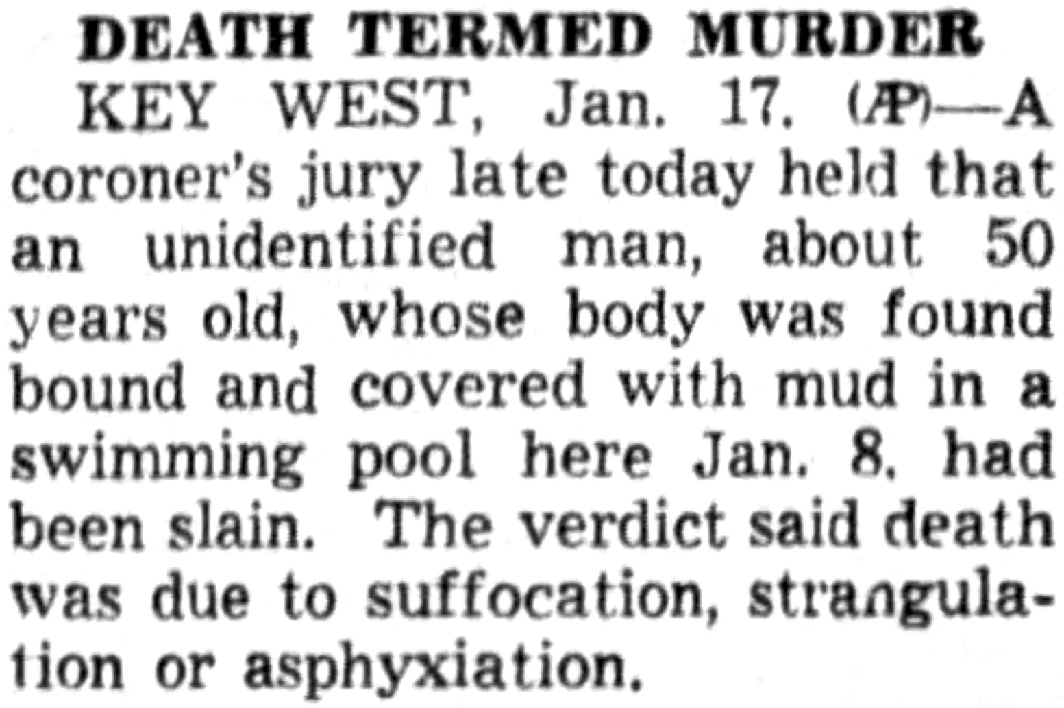 The misidentification was blamed on bloating and obscured facial features. Another lead regarding a missing fisherman also surfaced, but this man was also found alive. Although there was speculation the man committed suicide, no water was found in his lungs, indicating he did not die in the pool. On January 18th, a coroner's jury ruled he died from "suffocation, strangulation or asphyxiation."