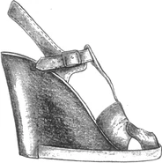 - Black clogs with leather straps and four-inch heels.