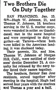 On the first day of the battle, Hugh was reportedly killed in action, although the circumstances of his death are unknown. On the night of November 22, 1943 two days later, Thomas ran forty yards under heavy fire to pick up ammunition for his squad as they were running out of it during a Japanese counterattack. He was struck by shrapnel on the return, but managed to deliver the ammunition before succumbing to his wounds.